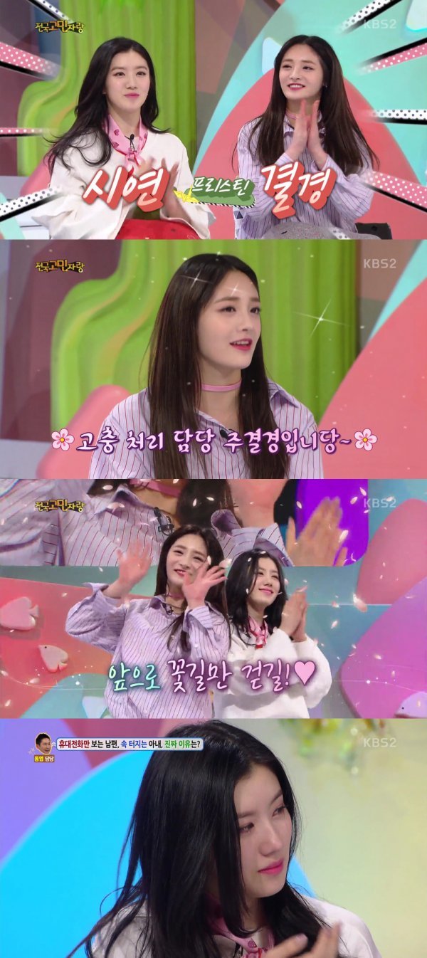 이날 예능프로그램에 첫 출연한 프리스틴의 두 멤버 결경과 시연은 등장하자마자 남심 저격수라고 소개되며 시청자들의 시선을 모았다. 상큼한 인사로 자신들을 소개한 뒤 데뷔 앨범의 타이틀곡 ‘위 우(WEE WOO)’ 무대까지 선보인 결경과 시연은 진행자인 신동엽에게 어떤 고민 전문가인지에 대한 질문을 받자 결경은 "고충 처리 담당자인 저는 9인 9색 멤버들의 고민을 잘 들어준다"라고 했고, 시연 역시 "9년간 인생의 반을 연습생으로 살았기 때문에 인내 전문가"라고 대답했다.