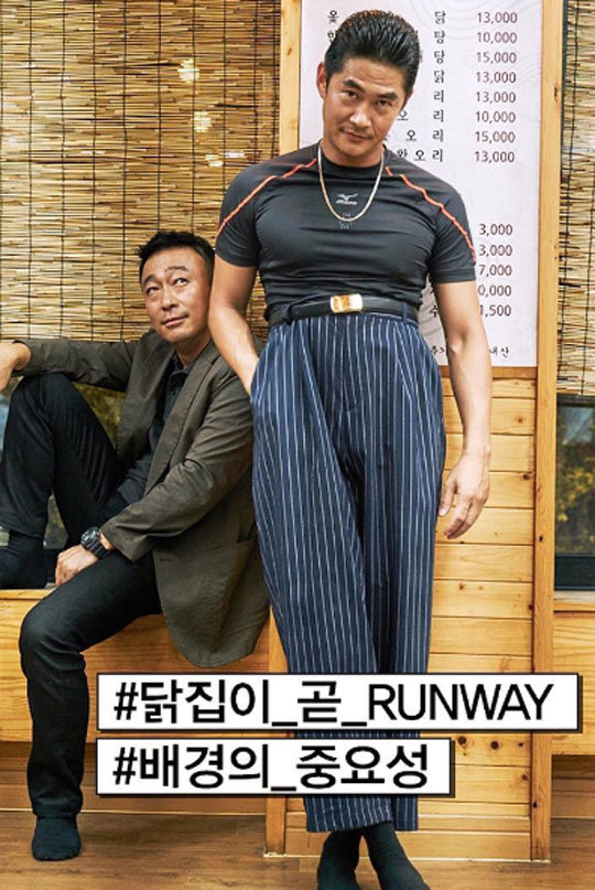 사진 속 배정남은 한눈에 봐도 형님 포스 풍기며 쫄티에 스트라이프 배바지로 패션을 완성해 웃음을 안겼다. 그 뒤로 배우 이성민이 그를 올려다 보고 있다. 사진 속 문구에는 ‘#닭집이 곧 런웨이#배경의 중요성’이라는 글로 또 한 번 웃음을 안긴다.