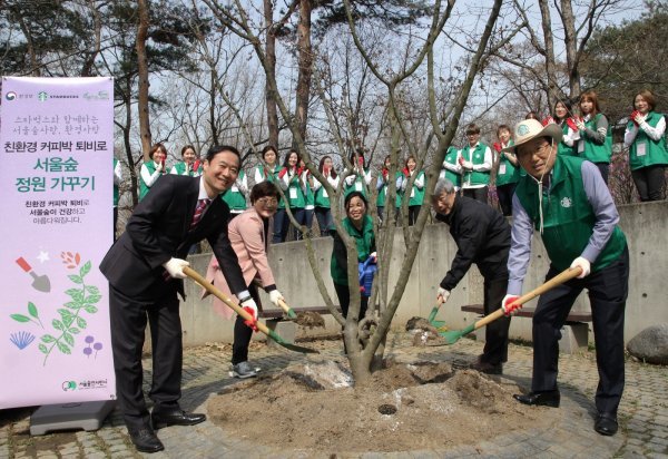스타벅스커피 코리아(대표 이석구)가 커피찌꺼기 재활용 활성화 시범사업 1주년을 맞아 서울숲공원에서 환경부, 자원순환사회연대, 서울숲컨서번시, 협력사와 함께 자원봉사자 300명이 참석하는 자원순환 실천 캠페인 활동을 전개했다. 이 날 활동을 기념해 스타벅스커피 코리아 이석구 대표이사(오른쪽 1번째), 환경부 김동진 자원순환국장(왼쪽 1번째), 자원순환사회연대 김미화 사무총장(왼쪽 2번째), 서울숲컨서번시 이은욱 대표이사(오른쪽 2번째)가 참석해 기념 식수을 심었다. 사진제공 스타벅스코리아