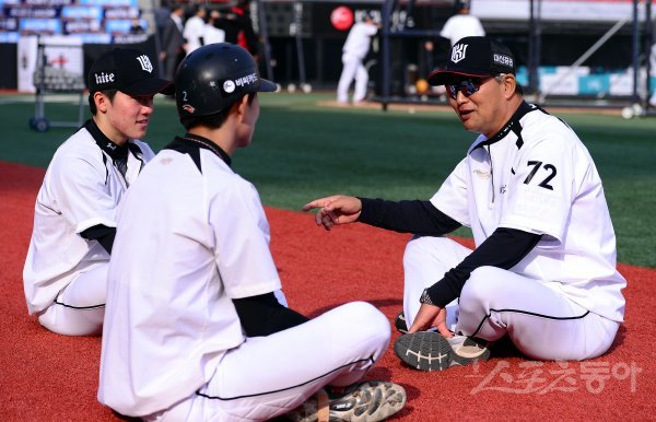 4일 수원 kt위즈파크에서 ‘2017 타이어뱅크 KBO 리그’ 두산베어스와 kt위즈 경기가 열린다. 김진욱 kt 감독이 그라운드에 앉아 홍현빈, 심우준과 이야기 하고 있다.