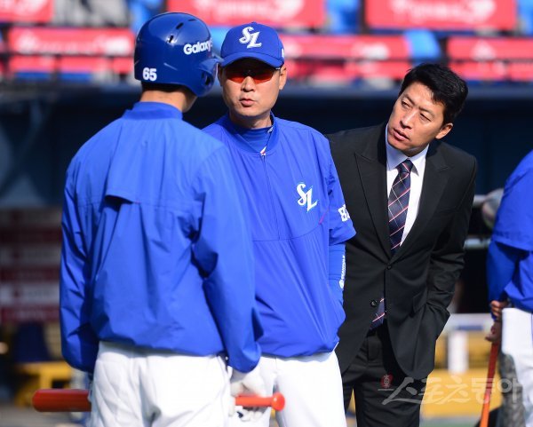 4일 잠실야구장에서 ‘2017 타이어뱅크 KBO 리그’ LG트윈스와 삼성라이온즈의 경기가 열린다. 경기를 앞두고 해설위원으로 데뷔한 이병규(오른쪽)가 삼성 김한수 감독과 구자욱(왼쪽)의 대화를 유심히 듣고 있다.