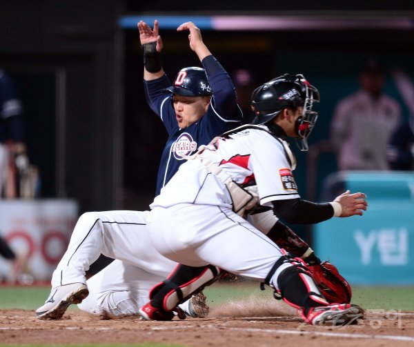 4일 수원 kt위즈파크에서 ‘2017 타이어뱅크 KBO 리그’ 두산베어스와 kt위즈 경기가 열렸다. 2회초 무사 만루 두산 김재호 외야플라이 아웃 때 3루주자 오재일에 언더베이스 시도해 홈에서 세이프 되고 있다.
