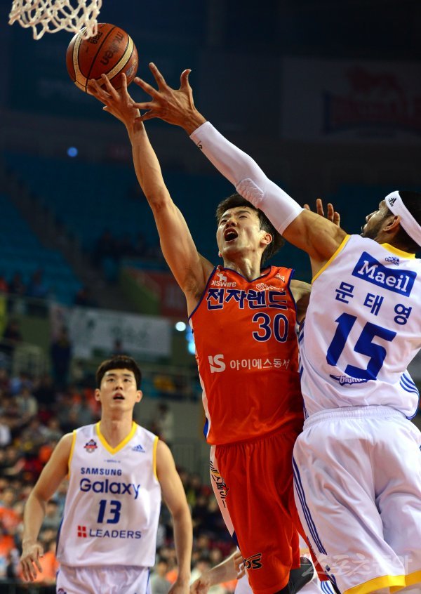 4일 인천 삼산월드체육관에서 열린 ‘2016-2017 KCC 프로농구’ 인천 전자랜드와 서울 삼성의 6강 플레이오프 경기에서 전자랜드 박찬희가 삼성 문태영의 수비를 피해 슛을 쏘고 있다.