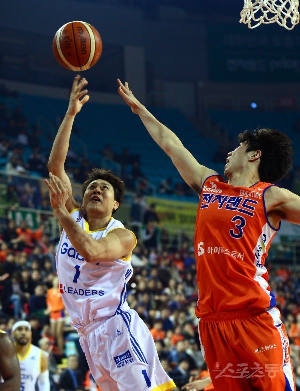 4일 인천 삼산월드체육관에서 열린 ‘2016-2017 KCC 프로농구’ 인천 전자랜드와 서울 삼성의 6강 플레이오프 경기에서 삼성 김태술이 전자랜드 김지완의 수비를 피해 슛을 쏘고 있다.