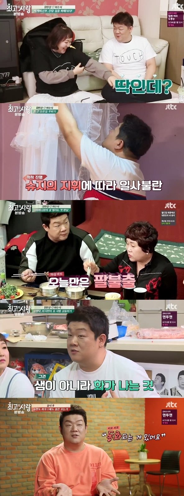 가상결혼생활 첫 날 유민상은 그동안 숨겨왔던 다정함으로 반전 매력을 뽐냈다. 집안 곳곳에 김민경의 흔적을 발견하고 질투한 이수지가 자신과 김민경 중 선택하라고 하자 유민상은 이수지를 선택, 기뻐하는 그녀를 꿀 떨어지는 눈으로 바라보며 귀여워했다. 또한 그녀가 원한다면 아끼는 옷도 내어주는 그의 행동에 안방극장이 함께 설레었다.