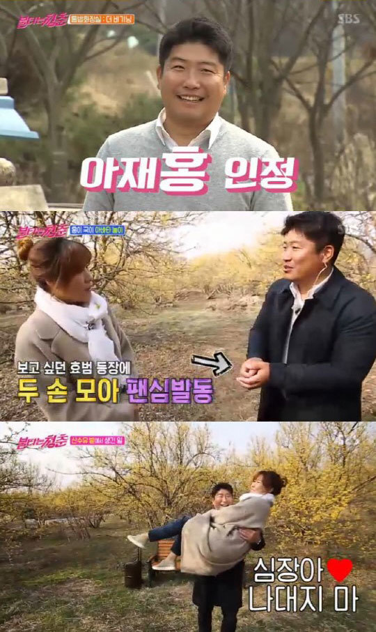 이어 신효범이 등장했고, 박재홍은 환한 미소를 지으며 기뻐했다. 두 사람은 방송 내내 다정한 대화를 나누며 서로를 알아갔고, 박재홍은 신효범을 번쩍 들어 안기까지하며 급 러브 라인(?)을 형성했다.