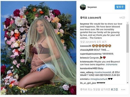 비욘세가 온라인에서도 이렇게 영향력을 갖게 된 이유는 올해 2월 쌍둥이를 임신했다는 사실을 알린 게 결정적이었다. 최근 화제가 되기도 했던 그의 만삭 사진은 ‘좋아요’ 1000만 기록을 달성했다. 이 기록은 가장 많은 ‘좋아요’를 받았던 셀레나 고메즈의 기록을 깬 것이기도 하다.