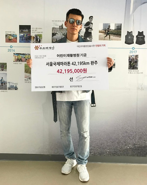 앞서 소속사 YG엔터테인먼트는 “션이 지난달 19일 서울국제마라톤대회에서 첫 풀코스 마라톤을 3시간39분13초에 완주했고, 이를 기념해 어린이재활병원에 4219만 5000원을 기부했다”고 밝혔다.