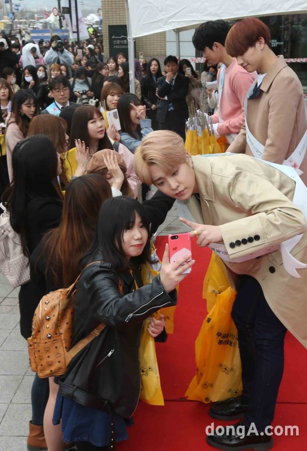 그룹 갓세븐이 5일 오후 서울 종로구 동아미디어센터 앞에서 열린 식목일 기념 무궁화 나눔 행사에 참석해 포토타임을 갖고 있다.