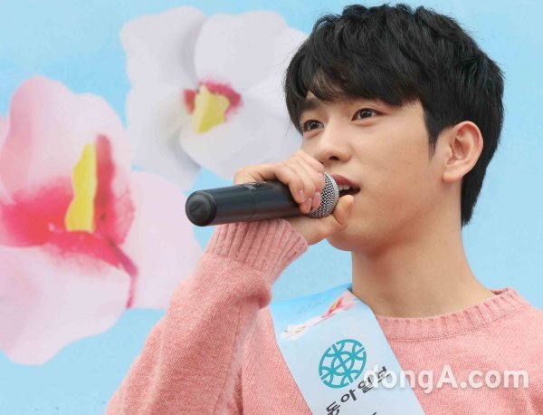그룹 갓세븐의 진영이 5일 오후 서울 종로구 동아미디어센터 앞에서 열린 식목일 기념 무궁화 나눔 행사에 참석해 인사말을 하고 있다.