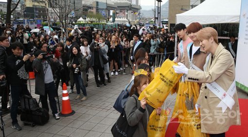 화사한 봄 코트와 진 차림의 갓세븐은 단상 앞으로 줄지어선 시민들에게 무궁화 묘목을 나눠주며 “잘 가꾸어 달라”고 당부했다. 이와 함게 행사에서 내내 웃음을 잃지 않았고, 시민들의 기념사진 요청에도 친절히 응하며 함께 ‘셀카’를 찍는 팬서비스로도 주목받았다.