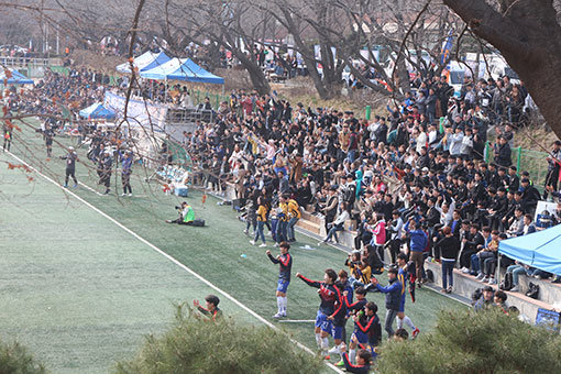아주대학교 축구부는 대학리그에서 홈 팬들의 응원 열기가 뜨겁기로 정평이 난 팀이다. 최근 2년 연속 U리그 최다 관중을 기록했고, 3년 연속 한국대학스포츠총장협의회가 선정한 최우수 홍보대학이다. 지난달 24일 열린 고려대학교와의 ‘2017 U리그’ 홈 개막전에서는 무려 1753명의 관객이 경기장을 가득 메웠는데, 선수 가족과 친구들이 관중의 대부분인 대학축구에선 감히 꿈꾸기도 어려운 숫자다. 그럼에도 아주대의 홈 개막전은 매해 1000명 이상의 관객이 찾는다. 학생들은 물론 지역 주민들까지 함께 즐기는 ‘축제의 장’이 된다. 대학리그에선 이례적으로 이와 같은 적극적인 응원 문화가 자리 잡기까지 2015년 처음 생겨난 아주대 축구부 프런트의 공이 컸다.