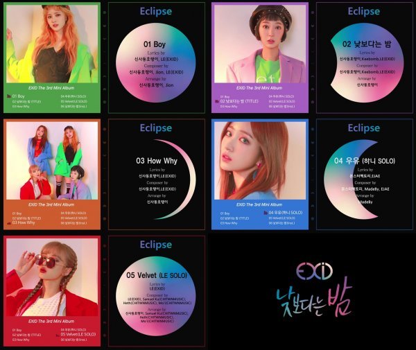 이번 미니앨범 ‘이클립스(Eclipse)’는 리드미컬한 멜로디가 돋보이는 타이틀곡 ‘낮보다는 밤’은 물론, 센스있는 가사와 독특한 구성이 돋보이는 ‘How Why’, 하니와 LE의 솔로곡 등이 담긴 알찬 구성으로 눈길을 끈다. 베일에 싸여있던 5번 트랙 ‘벨벳(Velvet)’이 LE의 솔로곡으로 밝혀지며 팬들의 기대감을 더하고 있는 상황이다.