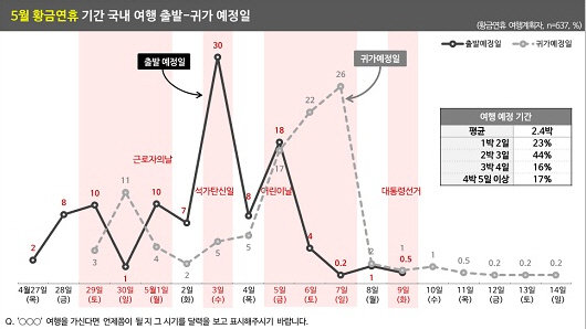 황금연휴 때 출발과 귀가 예정일은, 석가탄신일인 5월3일 수요일에 30%, 어린이날인 5일 금요일에 18%가 출발 예정으로 거의 절반을 차지했다. 귀가 예정은 5월7일 일요일에 26%, 6일 토요일에 22%였다. 여행기간은 평균 2.4박이며 2박3일 일정이 44%로 가장 많았고, 이어 1박2일이 23%였다. 지난해와 비교해 1박2일 일정이 줄고 2박3일이 늘었다.