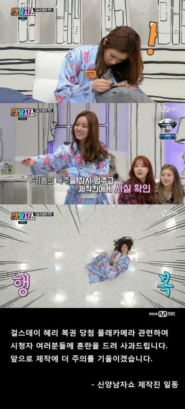 지난 6일 방송된 ‘신양남자쇼’ 걸스데이 편에서는 걸스데이가 퀴즈를 통해 즉석 복권을 상품으로 받았고, 혜리의 복권이 2000만 원에 당첨되는 모습이 그려졌다. 하지만 당첨됐다는 사실만 방영됐을 뿐, ‘몰카’라는 자막이나 상황 고지는 없었고, 결국 혼선이 빚어졌다.
