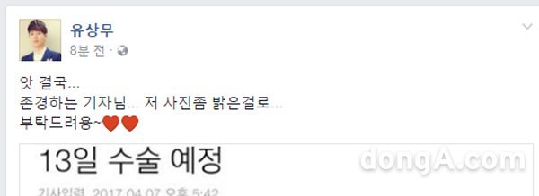 유상무 역시 SNS 계정을 통해 대장암 수술에 대해 글을 올렸다. 유상무는 “앗 결국… 존경하는 기자님. 저 사진좀 밝은걸로.부탁드려요”라고 적었다.