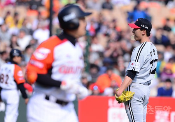 9일 부산 사직야구장에서 ‘2017 타이어뱅크 KBO 리그’ 롯데자이언츠와 LG트윈스의 경기가 열렸다. 4회말 1사 만루에서 LG 두 번째 투수 최동환이 롯데 손아섭에게 몸에 맞는 볼을 허용하며 실점을 하자 아쉬워하고 있다.