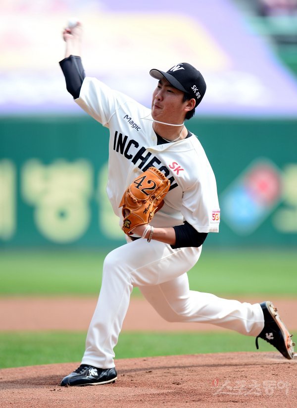 9일 인천 SK행복드림구장에서 ‘2017 타이어뱅크 KBO리그’ SK 와이번스와 NC 다이노스의 경기가 열렸다. SK 선발투수 문승원이 힘차게 볼을 던지고 있다.