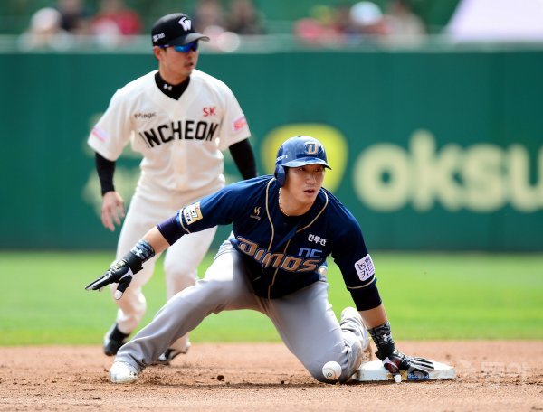 9일 인천 SK행복드림구장에서 ‘2017 타이어뱅크 KBO리그’ SK 와이번스와 NC 다이노스의 경기가 열렸다. 1회초 무사 1, 3루에서 NC 스크럭스 타석 때 1루주자 나성범이 2루 도루에 성공하고 있다.
