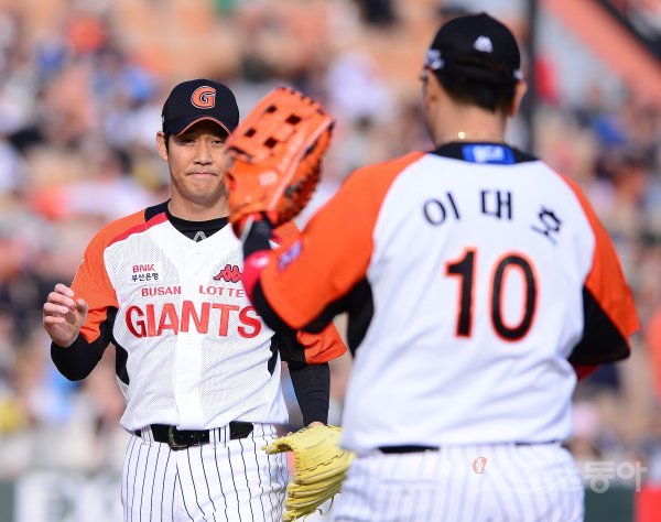 9일 부산 사직야구장에서 ‘2017 타이어뱅크 KBO 리그’ 롯데자이언츠와 LG트윈스의 경기가 열렸다. 8회초 등판한 롯데 세 번째 투수 윤길현이 이닝을 무실점으로 막은 후 이대호의 축하를 받고 있다.