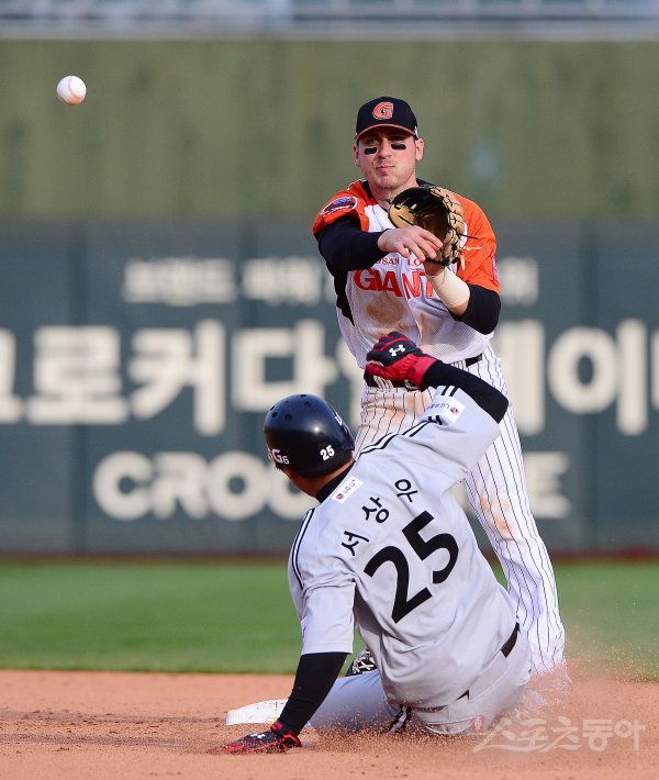 9일 부산 사직야구장에서 열린 ‘2017 타이어뱅크 KBO 리그’ 롯데자이언츠와 LG트윈스의 경기에서 롯데가 7-1로 승리하며 2연승과 함께 위닝시리즈를 기록했다. 9회초 1사 1,3루에서 롯데 2루수 번즈가 2루로 향하는 서상우를 포스아웃 시킨 후 1루로 송구하고 있다.