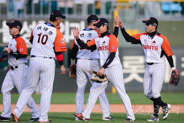 9일 부산 사직야구장에서 열린 ‘2017 타이어뱅크 KBO 리그’ 롯데자이언츠와 LG트윈스의 경기에서 롯데가 7-1로 승리하며 2연승과 함께 위닝시리즈를 기록했다. 경기 후 롯데 선수들이 기쁨을 나누고 있다.