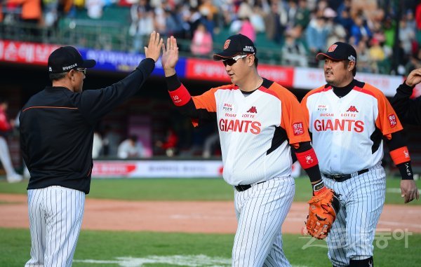 9일 부산 사직야구장에서 열린 ‘2017 타이어뱅크 KBO 리그’ 롯데자이언츠와 LG트윈스의 경기에서 롯데가 7-1로 승리하며 2연승과 함께 위닝시리즈를 기록했다. 경기 후 롯데 이대호가 조원우 감독(왼쪽)과 기쁨을 나누고 있다.