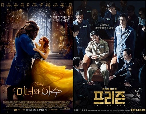 10일 영화진흥위원회 통합전산망에 따르면 7일부터 9일까지 ‘미녀와 야수’는 34만 7066명, ‘프리즌’은 24만 9851명의 관객을 모으며 각각 1,2위를 차지했다. .