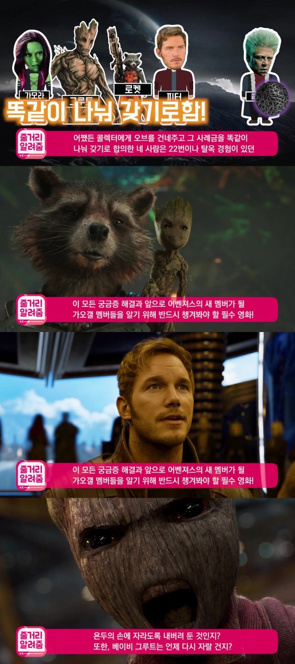 이번에 공개된 알려줌 영상은 전 편의 전체적인 줄거리와 이야기의 핵심 배경이 되는 공간, 그리고 ‘가.오.갤’의 독특한 캐릭터들의 배경에 대해 자세하고 친절한 설명이 담겨져 있다. ‘가.오.갤’ 멤버들이 하나의 팀을 이루게 되어 은하계를 구하게 된 스토리를 짧고 간결하게 전달하며 ‘가디언즈 오브 갤럭시 VOL. 2’에 대한 예습과 복습을 한번에 해결 할 수 있는 꿀팁을 선사한다.