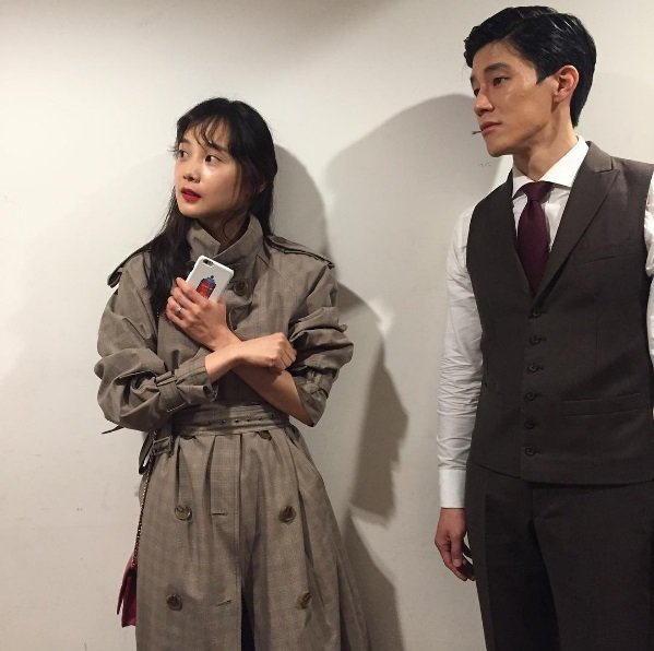 사진에는 윤승아와 김무열이 등장, 두 사람 모두 멀리 한 곳을 응시하고 있다. 윤승아가 남편 김무열의 뮤지컬 현장을 방문한 것으로 보이는 사진이다.