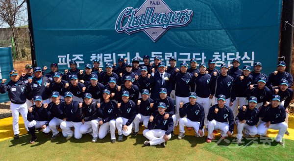 10일 경기도 파주 야당동 익사이팅 챌린저스파크에서 국낸 3번째 독립야구단인 ‘파주 챌린저스 독립야구단 창단식’이 열렸다. 양승호 초대감독 및 선수들이 카메라를 향해 포즈를 취하고 있다.