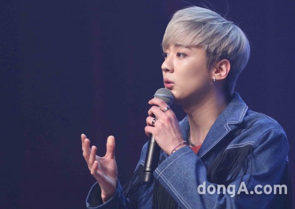 틴탑의 천지가 10일 오후 서울 강북구 성신여자대학교 대강당에서 진행된 두번째 정규 앨범 \'하이파이브\' 발매 기념 쇼케이스에 참석해 인사말을 하고 있다.