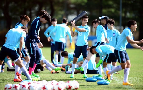 한국에서 열리는 ‘2017 FIFA U-20 월드컵’을 40일 앞두고 10일 경기도 파주 축구국가대표 트레이팅센터(NFC)에 U-20 대표팀 25명이 소집됐다. 축구대표팀 백승호(가운데)가 동료들과 장난치고 있다.