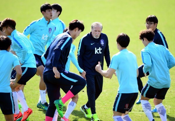 한국에서 열리는 ‘2017 FIFA U-20 월드컵’을 40일 앞두고 10일 경기도 파주 축구국가대표 트레이팅센터(NFC)에 U-20 대표팀 25명이 소집됐다. U-20 축구대표팀 루이스 플라비우 코치가 선수들의 훈련을 지시하고 있다.