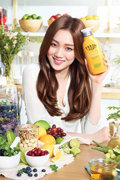 뷰티용품의 ‘후루츠메틱’ 붐을 대표하는 프레시팝 만다린 레시피 샴푸와 모델 이성경. 두피와 모발을 동시에 관리하는 건강샴푸의 기능과 함께 과일 만다린의 컬러와 향을 그대로 지녀 인기가 높다.