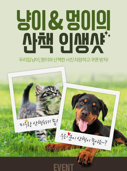 인터파크가 30일까지 반려동물 산책 사진 공유 이벤트를 연다. 반려동물 관련 올바른 문화 정착을 위한 캠페인 일환이다. 고양이·강아지의 산책 모습을 촬영해 SNS에 올려 공유한 후 ‘인터파크 펫’ 게시판에 글을 작성한 고객을 대상으로, 1∼3등에 각각 50·45·40% 중복 할인 쿠폰을 증정한다.