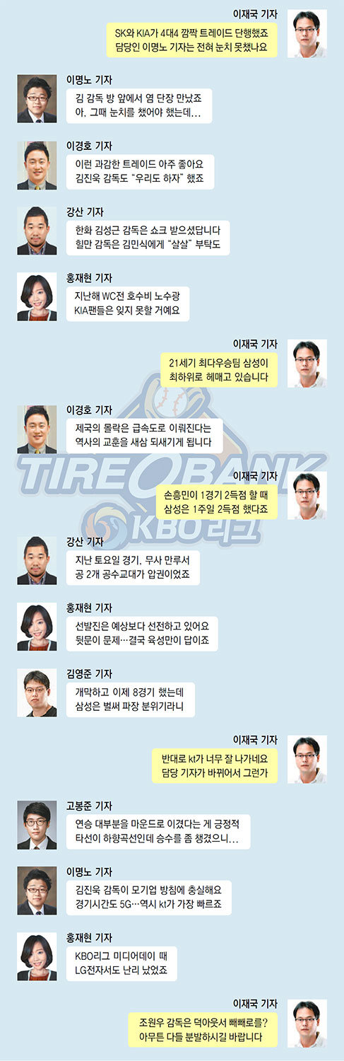 스포츠동아는 한 주 동안 벌어졌던 야구를 정리하고 숨은 뒷얘기를 전하기 위해 ‘LIVE톡’을 진행합니다. 지금까지의 기사 형식과는 전혀 다른 파격적인 구성입니다. 스포츠동아 야구담당 기자들이 인터넷 채팅을 통한 자유로운 발언으로 토해낸 내용을 편집 없이 날 것 그대로 담습니다. 이재국 기자(총괄)가 김영준(롯데 담당), 이경호(두산·NC 담당), 홍재현(LG·삼성 담당), 이명노(KIA·SK 담당), 강산(넥센·한화 담당), 고봉준(kt 담당·두산 2진) 기자를 대화창에 초대했습니다.