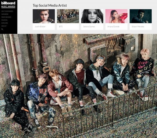 방탄소년단은 \'톱 소셜 미디어 아티스트(Top Social Media Artist)\' 부문에 이름을 올려 저스틴 비버(Justin Bieber), 셀레나 고메즈(Selena Gomez), 아리아나 그란데(Ariana Grande), 션 멘데스(Shawn Mendes) 등 세계적인 팝스타들과 어깨를 나란히 했다.