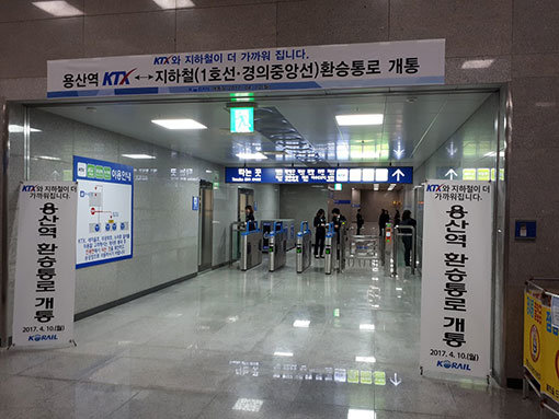 용산역 직통환승통로는 역무실로 사용하던 공간을 줄여 전철에서 KTX나 일반열차로 바로 갈아탈 수 있게 연결한 것이다.