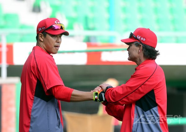 11일 인천 SK행복드림구장에서 ‘2017 타이어뱅크 KBO리그’ SK 와이번스와 롯데 자이언츠의 경기가 열린다. 경기전 SK 힐만 감독이 한동민의 손을 잡고 이야기를 나누고 있다.