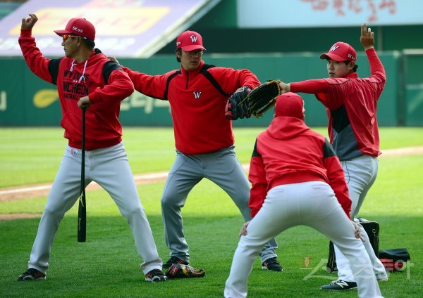 11일 인천 SK행복드림구장에서 ‘2017 타이어뱅크 KBO리그’ SK 와이번스와 롯데 자이언츠의 경기가 열린다. 경기전 SK 김도현이 코치들의 훈련을 받고 있다.