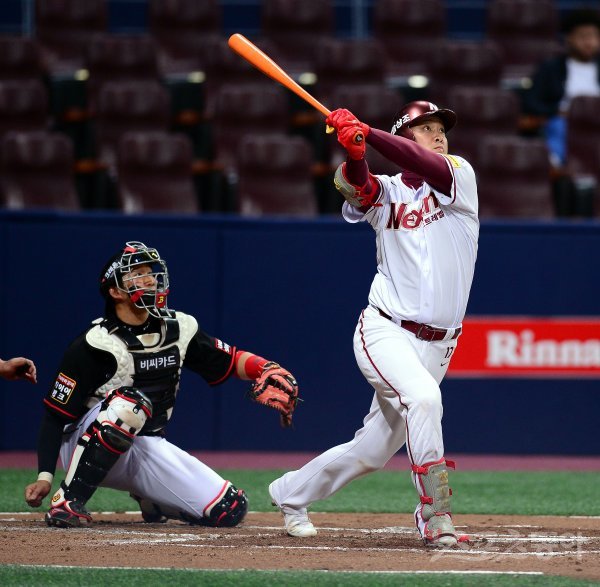 11일 서울 고척스카이돔에서 ‘2017 타이어뱅크 KBO 리그’ kt위즈와 넥센히어로즈의 경기가 열렸다. 2회말 무사 넥센 채태인이 우월 솔로 홈런을 날리고 있다.