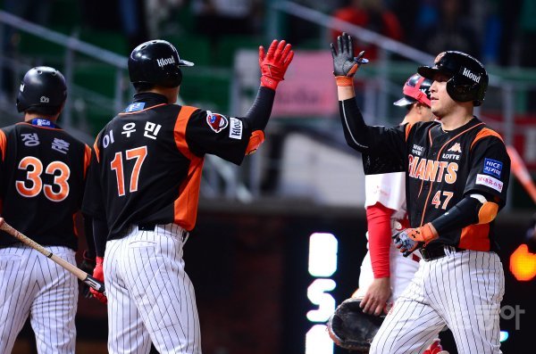 11일 인천 SK행복드림구장에서 ‘2017 타이어뱅크 KBO리그’ SK 와이번스와 롯데 자이언츠의 경기가 열렸다. 9회초 무사 1루에서 롯데 강민호가 SK 박정배를 상대로 좌월 투런 홈런을 쏘아올린 뒤 동료들의 환영을 받고 있다. 강민호는 통산 200홈런에 한개를 남겨뒀다.