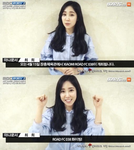 ‘야구여신’으로 유명한 방송인 최희가 4월 15일 열리는 XIAOMI ROAD FC 038 대회를 앞두고 출전 선수들에게 응원의 메시지를 전달했다.