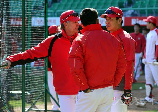 12일 인천 SK행복드림구장에서 ‘2017 타이어뱅크 KBO리그’ SK 와이번스와 롯데 자이언츠의 경기가 열린다. 경기전 SK 힐만 감독이 김강민과 이야기를 나누고 있다.