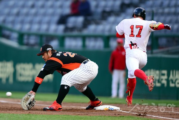 12일 인천 SK행복드림구장에서 ‘2017 타이어뱅크 KBO리그’ SK 와이번스와 롯데 자이언츠의 경기가 열렸다. 1회말 무사에서 SK 노수광이 내야땅볼을 치고난 뒤 1루로 달렸으나 아웃되고 있다.