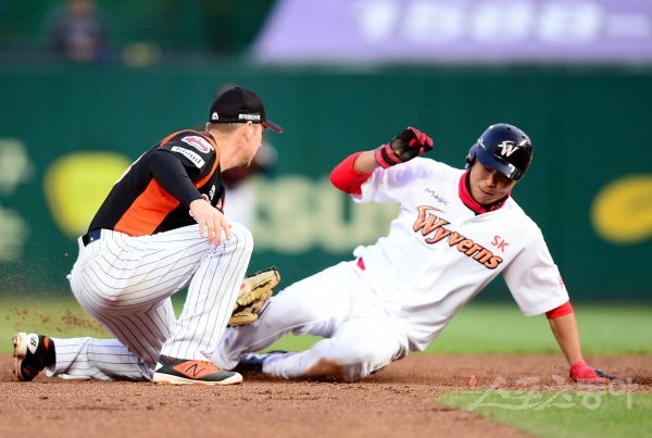 12일 인천 SK행복드림구장에서 ‘2017 타이어뱅크 KBO리그’ SK 와이번스와 롯데 자이언츠의 경기가 열렸다. 2회말 2사 2루에서 SK 이재원 타석 때 1루주자 한동민이 투수 폭투로 2루까지 진루하고 있다.