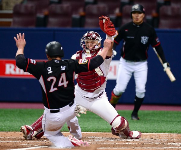 12일 서울 고척스카이돔에서 ‘2017 타이어뱅크 KBO 리그’ kt위즈와 넥센히어로즈의 경기가 열렸다. 3회초 2사 2루 kt 유한준의 좌전 안타 때 2루주자 모넬이 홈까지 달려 세이프 되고 있다.