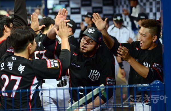 12일 서울 고척스카이돔에서 ‘2017 타이어뱅크 KBO 리그’ kt위즈와 넥센히어로즈의 경기가 열렸다. 3회초 2사 2루 kt 유한준의 좌전 안타 때 2루주자 모넬이 홈까지 달려 세이프 된 후 더그아웃에서 하이파이브 하고 있다.