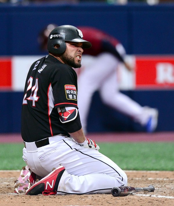 12일 서울 고척스카이돔에서 ‘2017 타이어뱅크 KBO 리그’ kt위즈와 넥센히어로즈의 경기가 열렸다. 7회초 2사 1,2루 kt 모넬이 데드볼을 맞고 고통스러워 하고 있다.